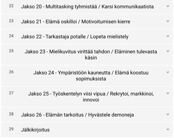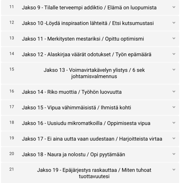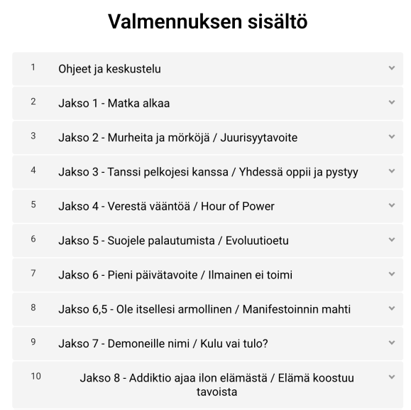 Tässä vielä koko valmennuksen sisällöt jaksoja kohti: