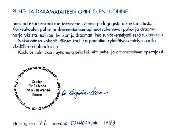 - “Märchen inszenieren mit marionetten” – kurssi, Goetheanum, Sektion für Redende und Musizierende Künste, Dornach, Sveitsi, 4.―25.6.1989